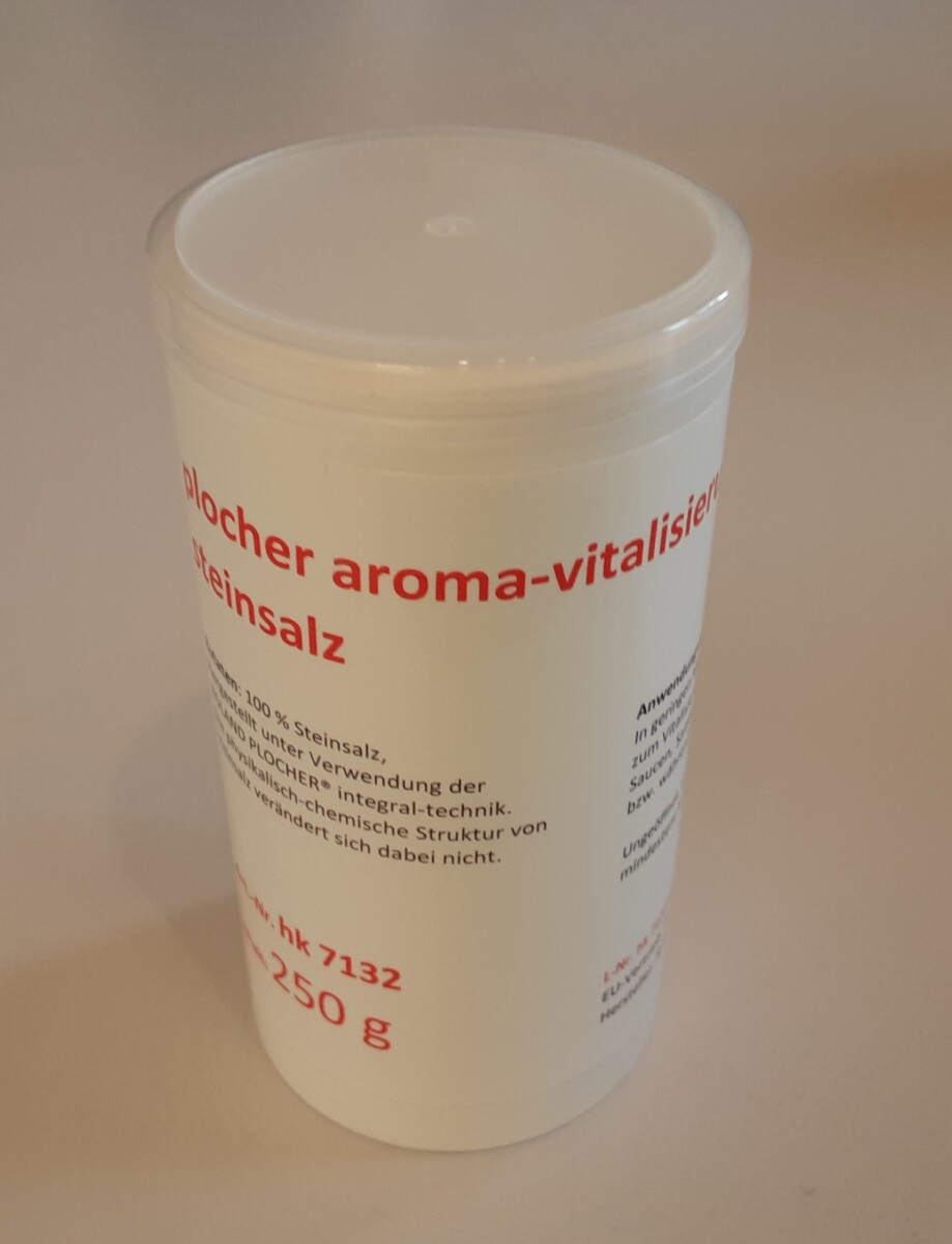 plocher aroma-vitalisierung steinsalz wird in geringen Mengen (etwa wie Speisesalz dosiert) zum Vitalisieren des individuellen Lebensmittelaromas bei Gemüse, Saucen, Suppen, Salaten und anderen Lebensmitteln, schon zum Kochen oder während der Zubereitung beigegeben.